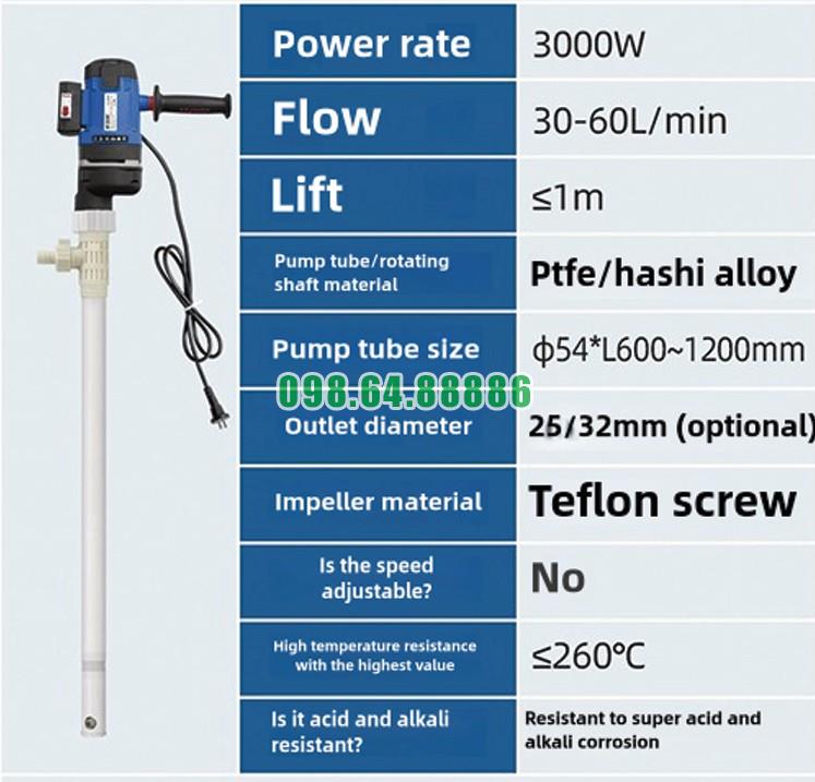 Bơm hút dung môi hóa chất thùng phuy JDT-3000W-PTFELG