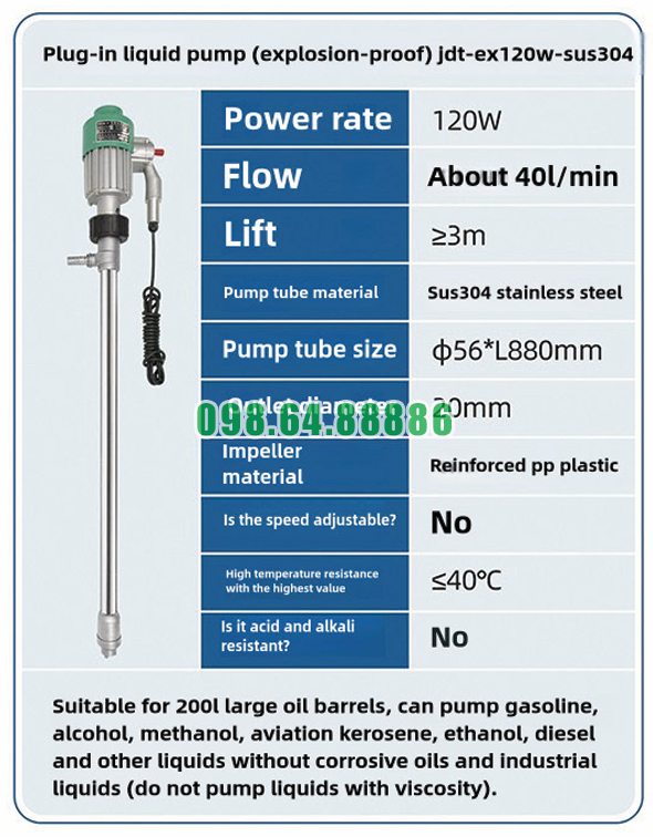 Cách Bơm chất lỏng cắm điện chống cháy nổ JDT-EX120W-SUS304 tạo ra áp lực đẩy cao dựa trên nguyên lý vận hành hiệu quả và sự phối hợp đồng bộ giữa động cơ, cánh bơm và cấu trúc thiết kế. Nhờ đó, thiết bị có thể đạt cột áp ≥ 3m, đáp ứng tốt nhu cầu bơm hút và vận chuyển chất lỏng trong nhiều điều kiện khác nhau.