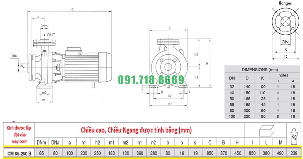 Thông số kỹ thuật bơm nước công nghiệp model CM65-250B