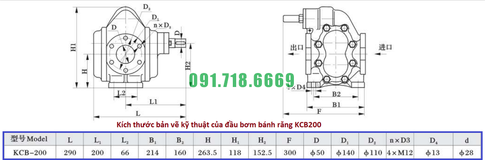 Bảng thông số kỹ thuật của bơm bánh răng KCB200 lưu lượng 12 m3 công suất 4 kw
