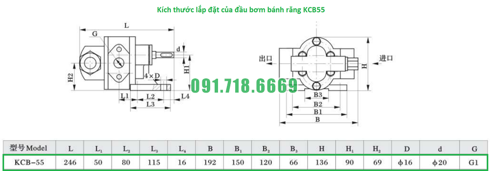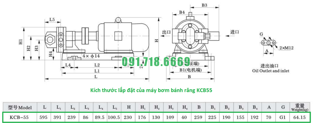 Bảng thông số kỹ thuật của bơm bánh răng vỏ gang thép model KCB55