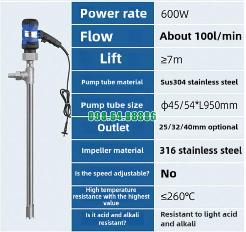 Bơm chìm hút thùng phuy nhiệt độ cao JDT-600W-G260
