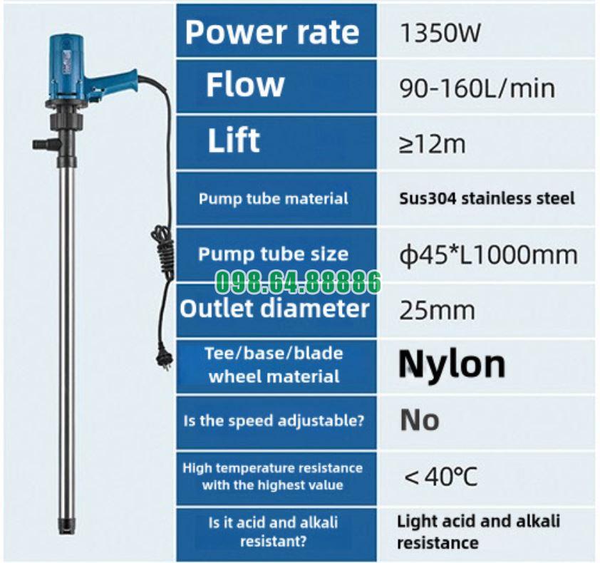 Bơm điện hút thùng phuy JDT-1350W-SUS304N được tối ưu cho các loại thùng phuy 200 lít