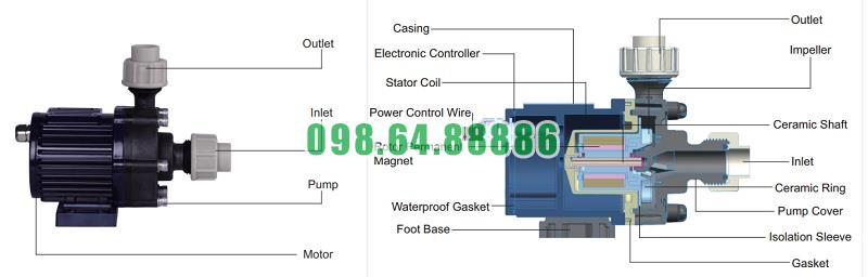 - Không giống như bơm ly tâm thông thường sử dụng trục cơ khí trực tiếp, TDM-70ERU-DC24 sử dụng khớp từ (Magnetic Coupling) để truyền động từ động cơ đến cánh bơm.