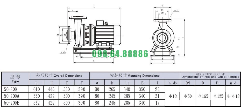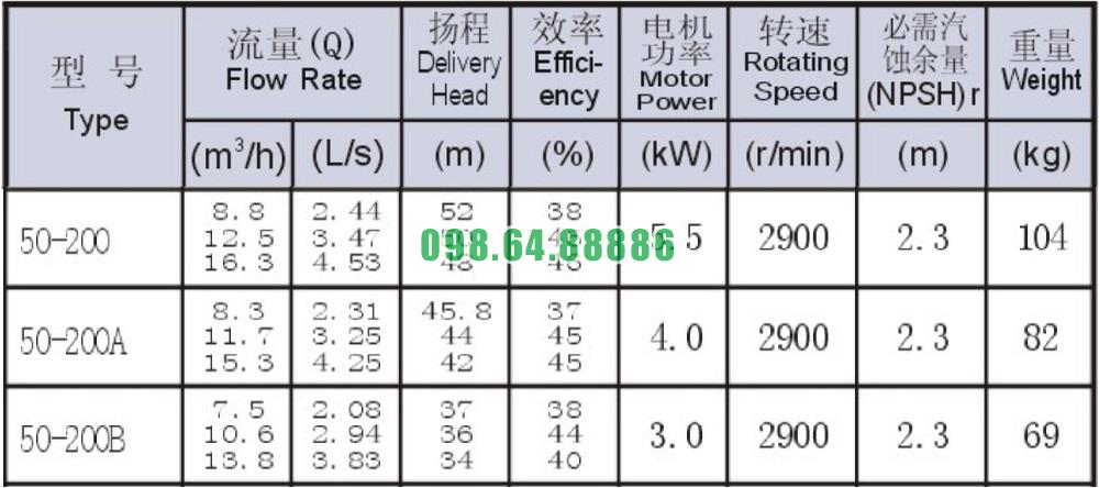 Bảng thông số kỹ thuật bơm li tâm trục ngang mode SLW-ISW50-200