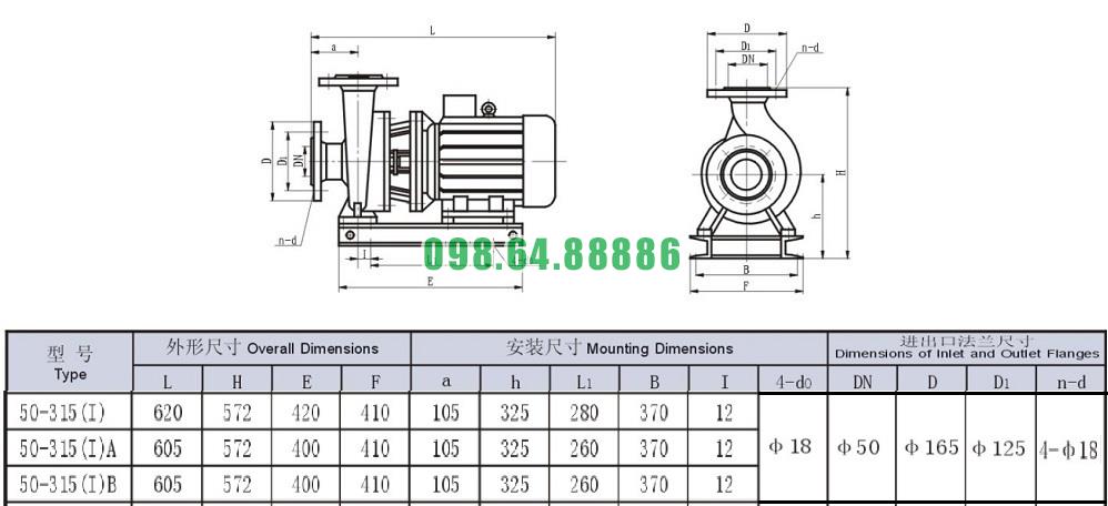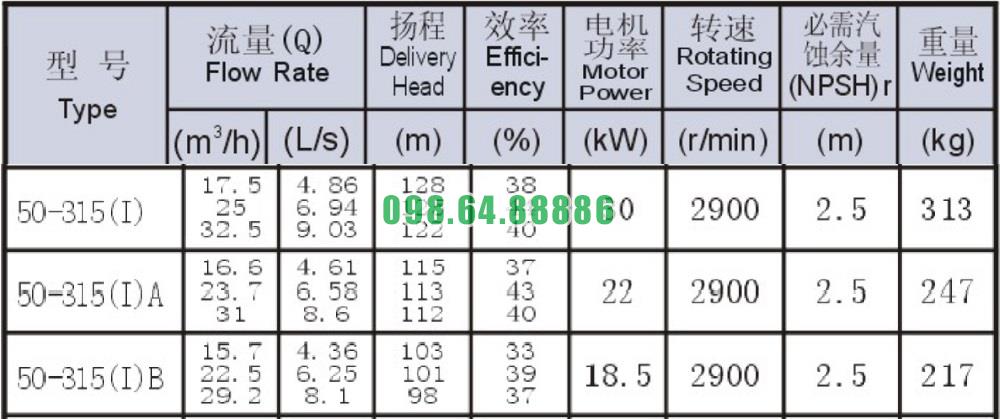 Bảng thông số kỹ thuật bơm li tâm trục ngang mode SLW-ISW50-315-I