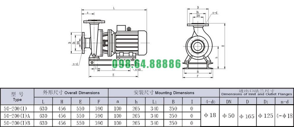 Bản vẽ cấu tạo và kích thước bơm li tâm trục ngang model SLW-ISW50-200-I công suất 9.03 L/s