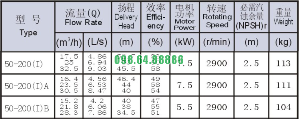 Bảng thông số kỹ thuật bơm li tâm trục ngang model SLW-ISW50-200-I công suất 9.03 L/s
