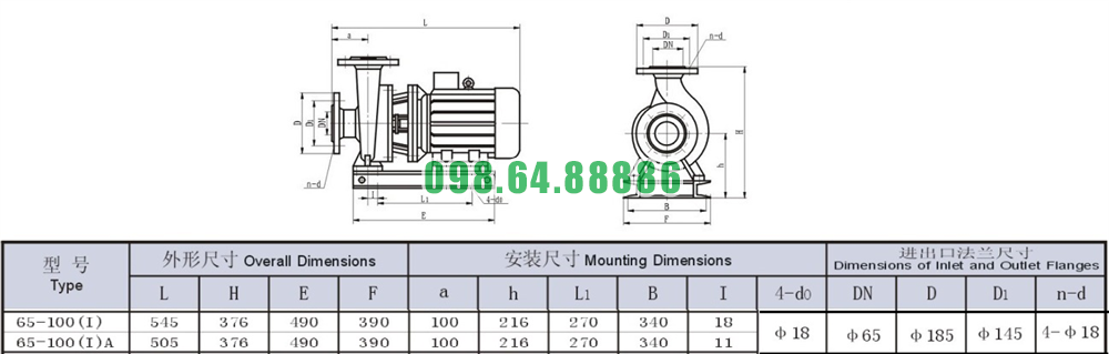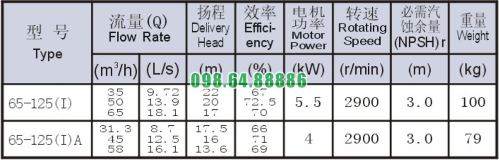 Bảng thông số kỹ thuật bơm li tâm trục ngang model SLW65-ISW65-125-I công suất 18.1 L/s