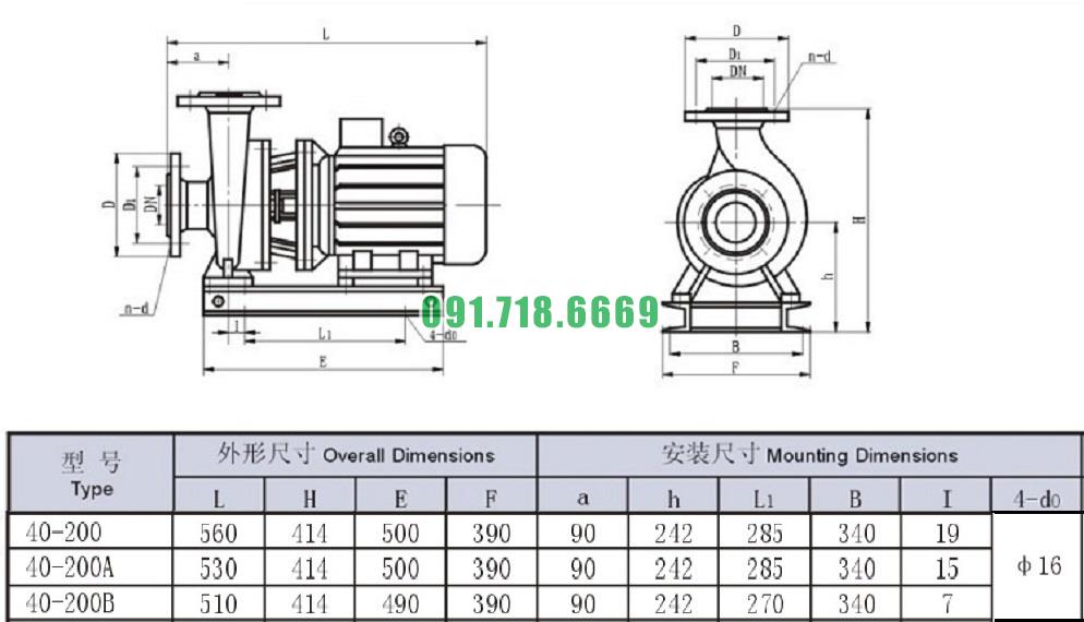 Bản vẽ cấu tạo và kích thước bơm li tâm trục ngang SLW-ISW40-200-I công suất 5.5 kw lưu lượng 16.3 m3/h