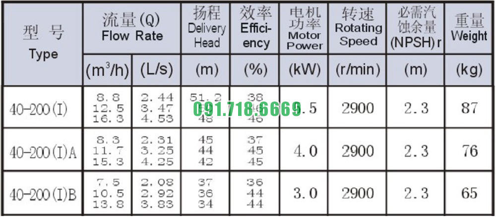 Bảng thông số kỹ thuật bơm li tâm trục ngang SLW-ISW40-200-I công suất 5.5 kw lưu lượng 16.3 m3/h