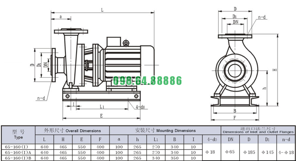 Bản vẽ cấu tạo và kích thước bơm li tâm trục ngang SLW65-ISW65-160-I công suất 7.5 kw lưu lượng 65 m3/h