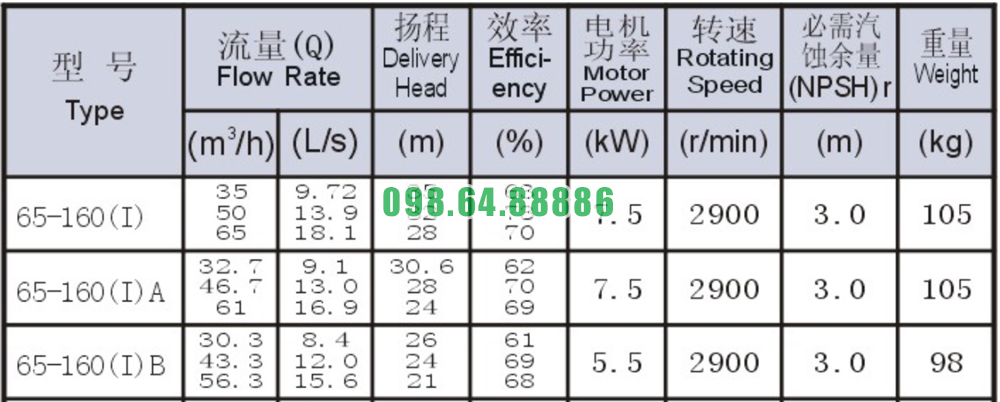 Bảng thông số kỹ thuật bơm li tâm trục ngang SLW65-ISW65-160-I công suất 7.5 kw lưu lượng 65 m3/h