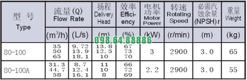 Bảng thông số kỹ thuật bơm li tâm trục ngang SLW80-ISW80-100 công suất 3 kw lưu lượng 65 m3/h