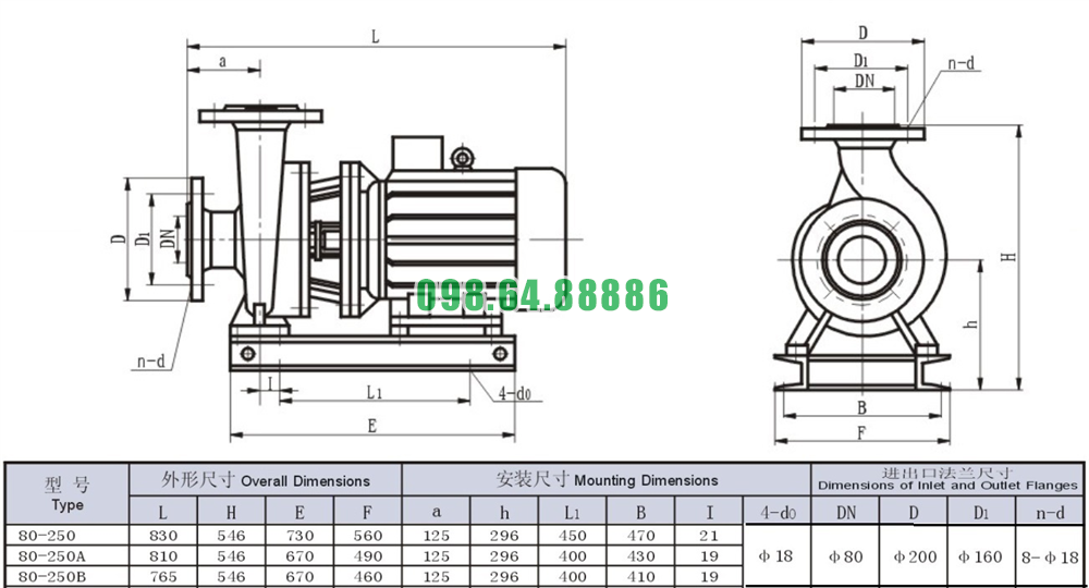 Bản vẽ cấu tạo và kích thước bơm li tâm trục ngang SLW80-ISW80-250 công suất 22 kw lưu lượng 65 m3/h