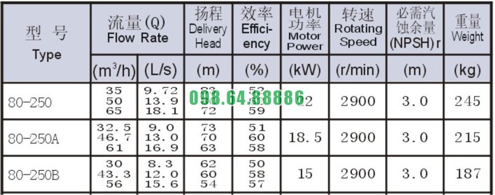 Bảng thông số kỹ thuật bơm li tâm trục ngang SLW80-ISW80-250 công suất 22 kw lưu lượng 65 m3/h