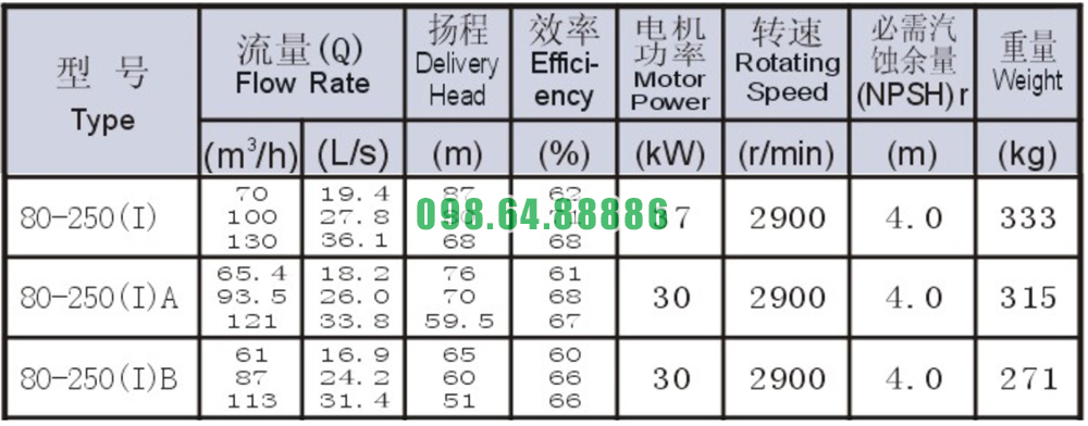 Bảng thông số kỹ thuật bơm nước li tâm trục ngang lưu lượng 36.1 L/s mã SLW80-ISW80-250-I