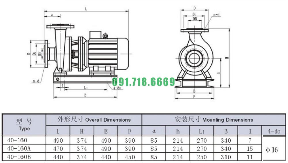 Bản vẽ cấu tạo và kích thước bơm nước nằm ngang SLW-ISW40-160 công suất 2.2 kw