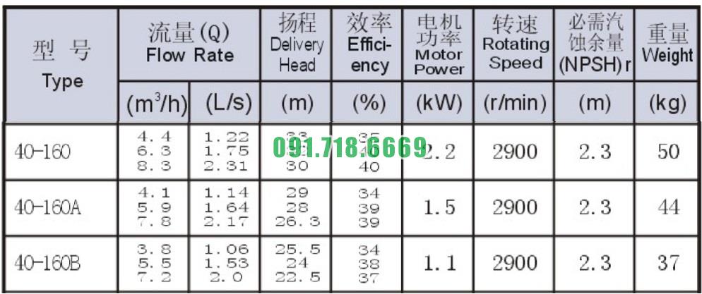 Bảng thông số kỹ thuật bơm nước nằm ngang SLW-ISW40-160 công suất 2.2 kw