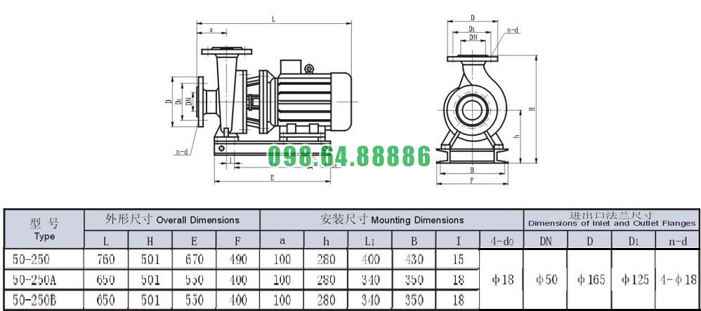 Bản vẽ cấu tạo và kích thước bơm nước nằm ngang SLW-ISW50-250 vòng quay 2900 r/min