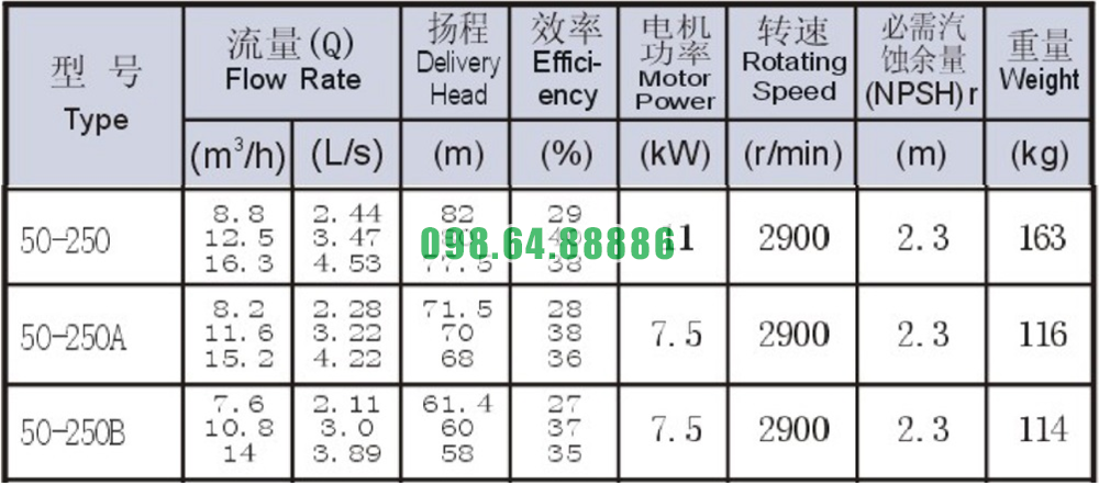 Bảng thông số kỹ thuật bơm nước nằm ngang SLW-ISW50-250 vòng quay 2900 r/min