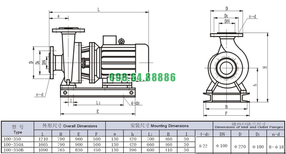 Bản vẽ cấu tạo và kích thước bơm nước nằm ngang SLW100-ISW100-350 năng suất từ 57% - 74%