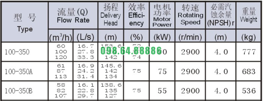 Bảng thông số kỹ thuật bơm nước nằm ngang SLW100-ISW100-350 năng suất từ 57% - 74%