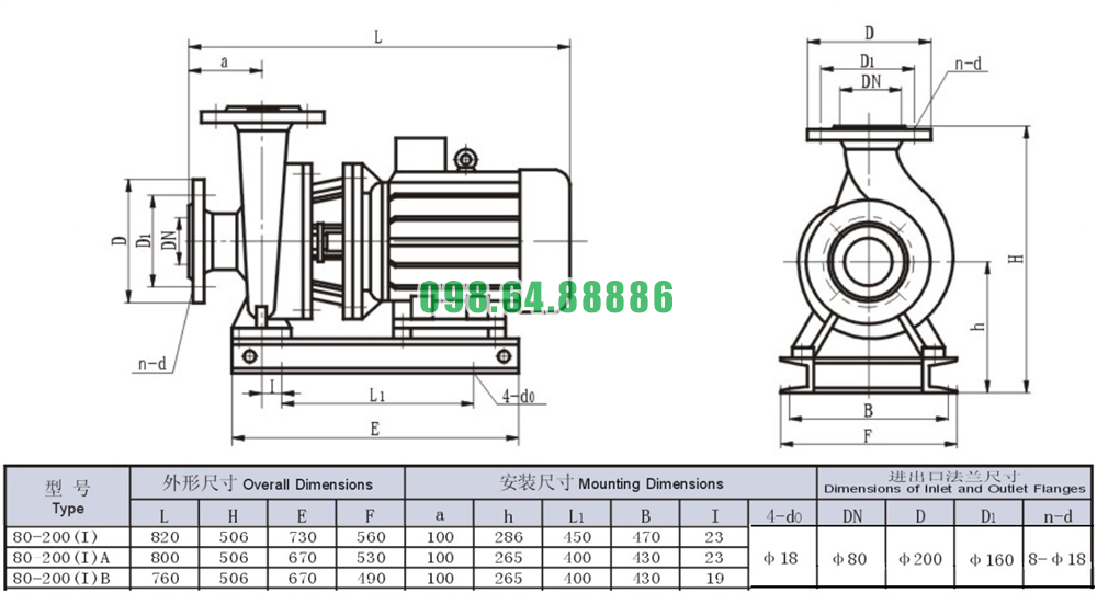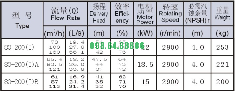 Bảng thông số kỹ thuật bơm nước nằm ngang SLW80-ISW80-200-I
