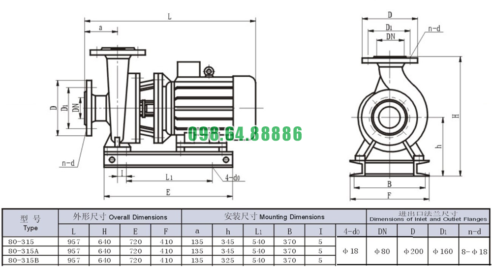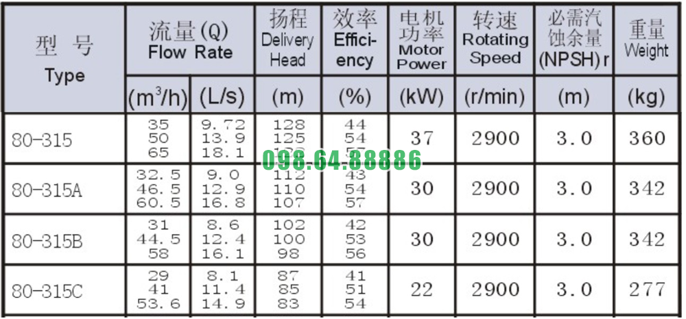 Bảng thông số kỹ thuật bơm nước nằm ngang SLW80-ISW80-315 vòng quay 2900 r/min