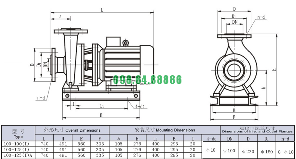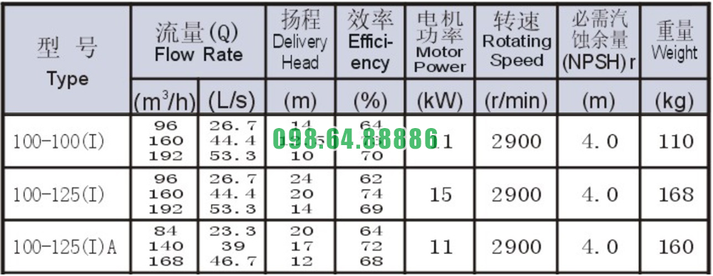 Bảng thông số kỹ thuật bơm nước trục ngang SLW100-ISW100-100-I động cơ 11 kw