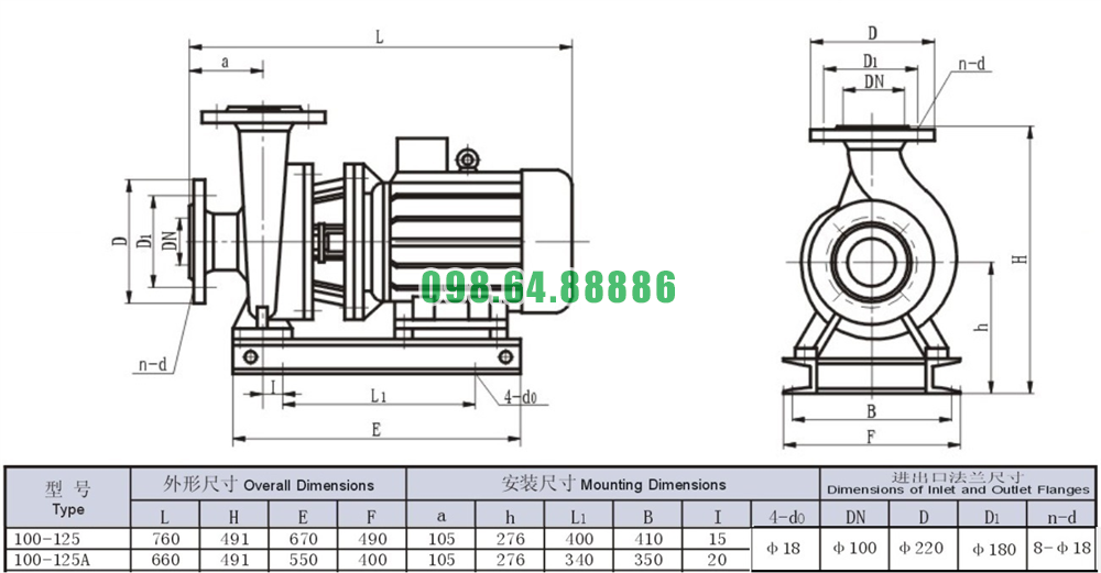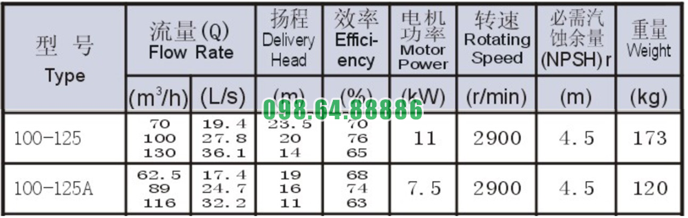 Bảng thông số kỹ thuật bơm nước trục ngang SLW100-ISW100-125 động cơ 11 kw