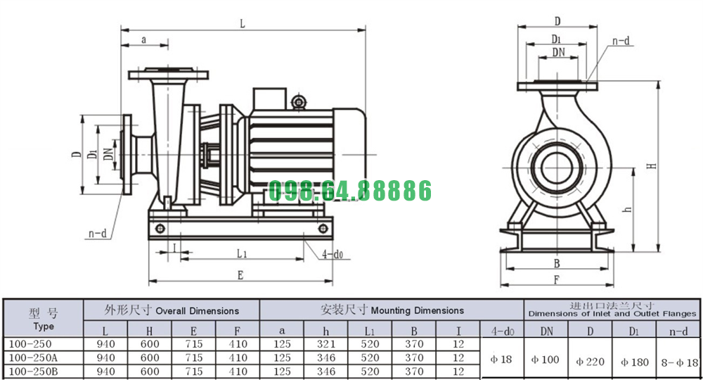 Bản vẽ cấu tạo và kích thước bơm nước trục ngang SLW100-ISW100-250 đẩy cao max 87m