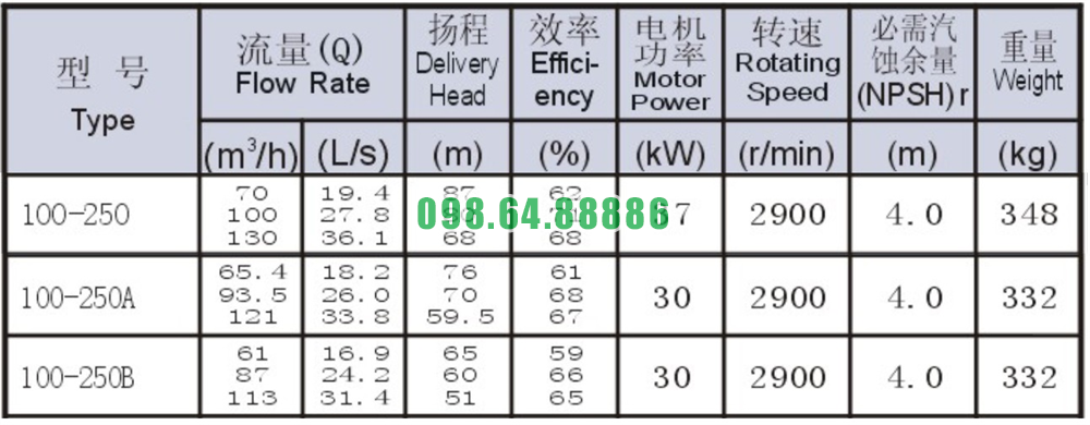 Bảng thông số kỹ thuật bơm nước trục ngang SLW100-ISW100-250 đẩy cao max 87m