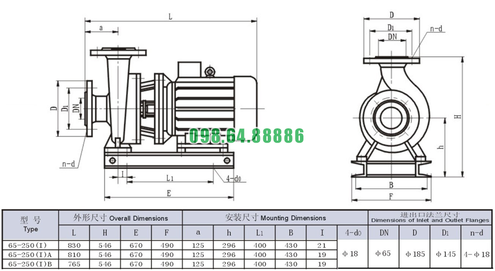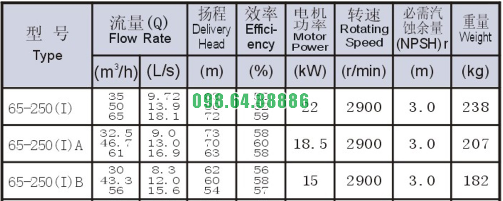Bảng thông số kỹ thuật bơm nước trục ngang SLW65-ISW65-250-I tốc độ quay 2900 r/min