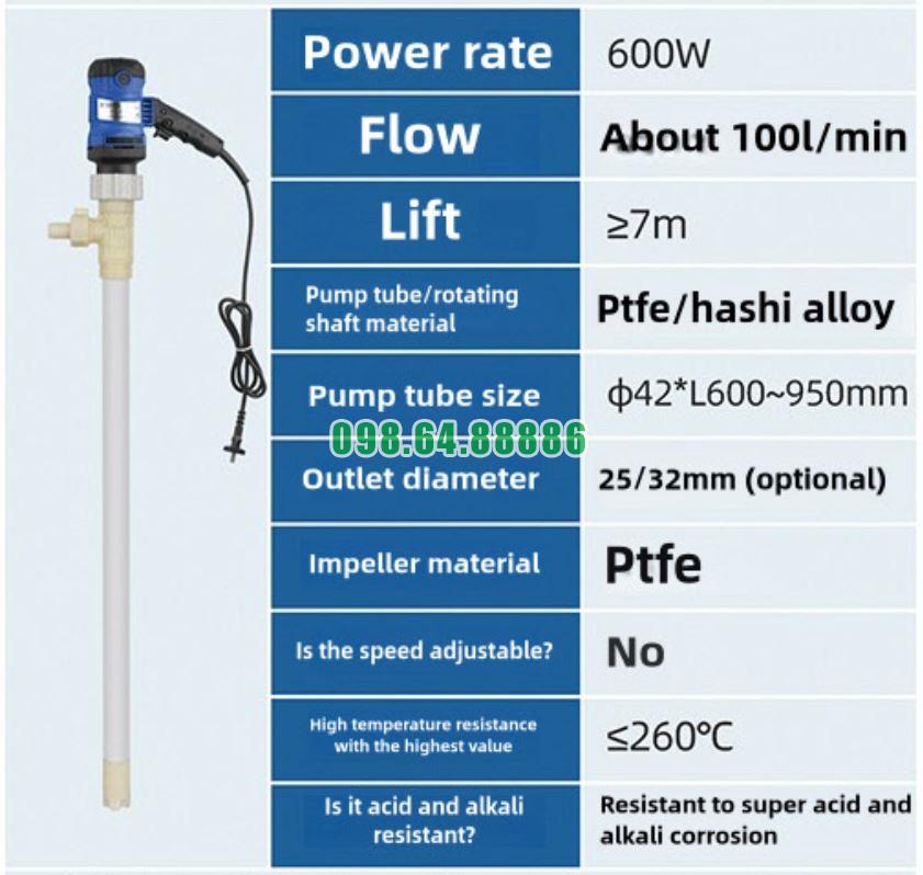 Bơm thùng phuy hóa chất loại nhúng, vật liệu PTFE chống ăn mòn model JDT-600W