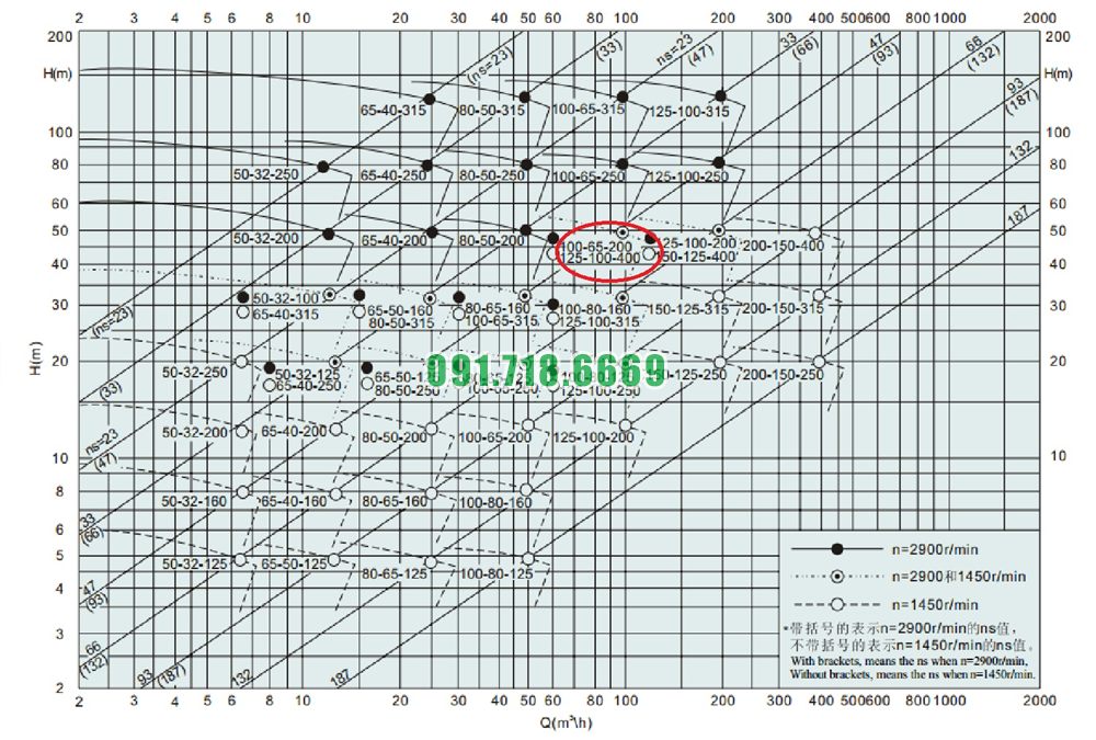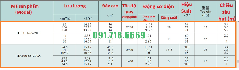 Bảng lưu lượng của máy bơm nước li tâm cánh hở IHK100-65-200 kích thước Dn100