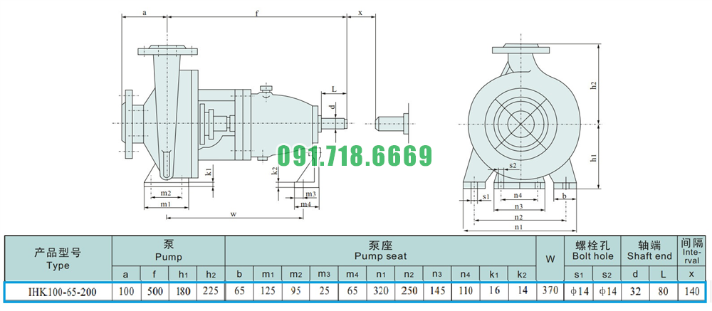 Kích thước của đầu máy bơm nước li tâm cánh hở IHK100-65-200 kích thước Dn100