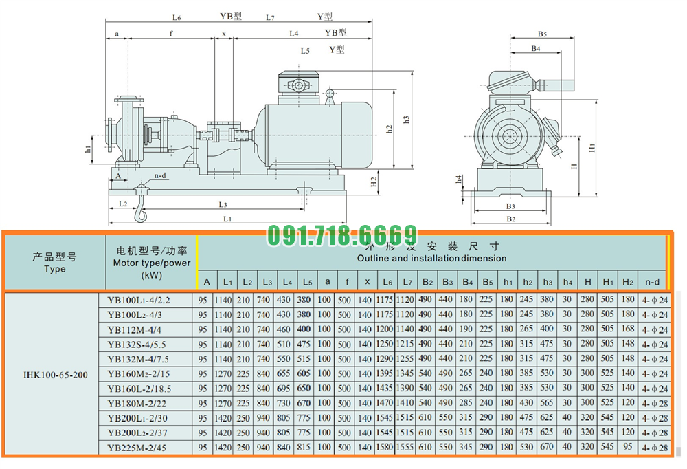 Kích thước lắp đặt của máy bơm nước li tâm cánh hở IHK100-65-200 kích thước Dn100