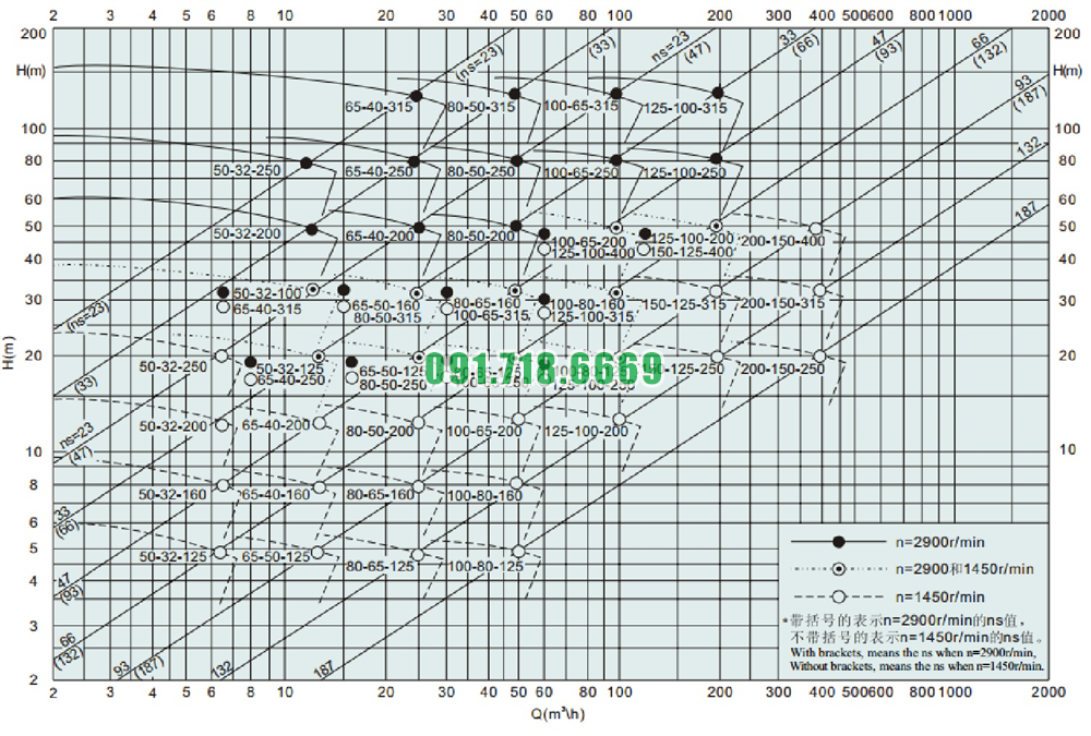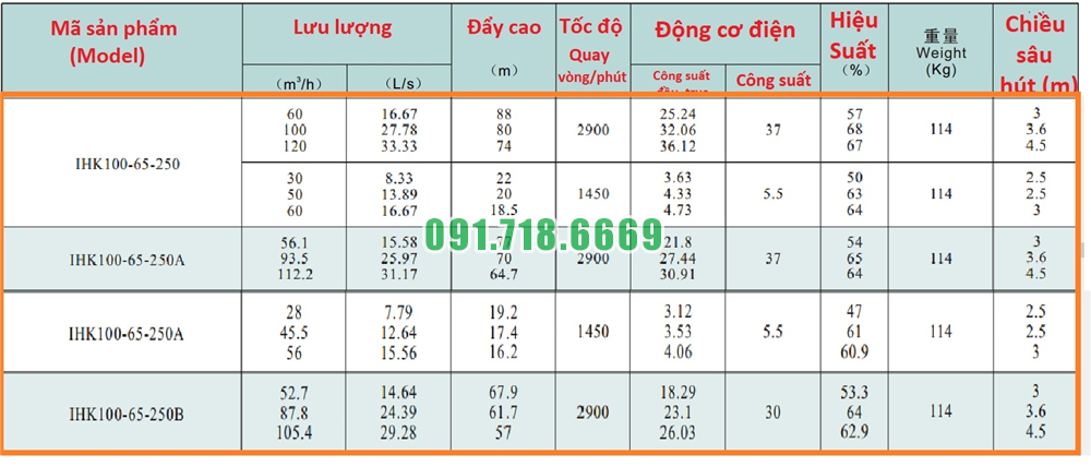 Bảng lưu lượng của máy bơm nước li tâm cánh hở IHK100-65-250 hiệu suất 120 m3/h