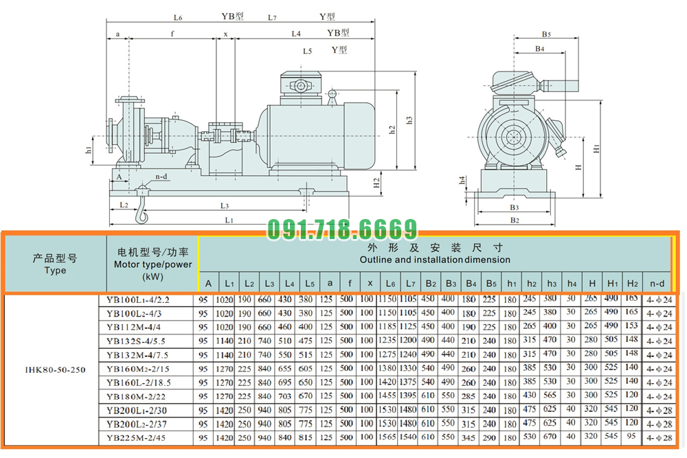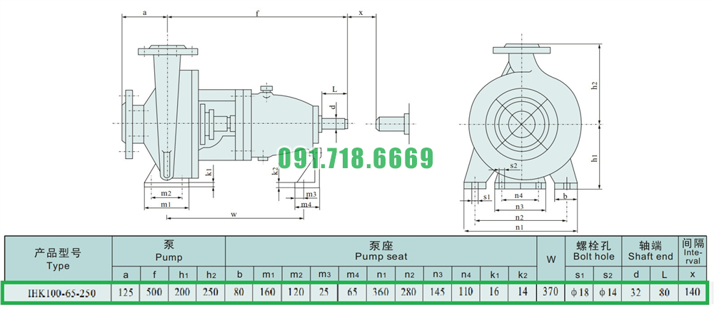 Kích thước của đầu máy bơm nước li tâm cánh hở IHK100-65-250 hiệu suất 120 m3/h