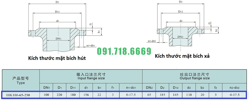 Kích thước mặt bích của máy bơm nước li tâm cánh hở IHK100-65-250 hiệu suất 120 m3/h
