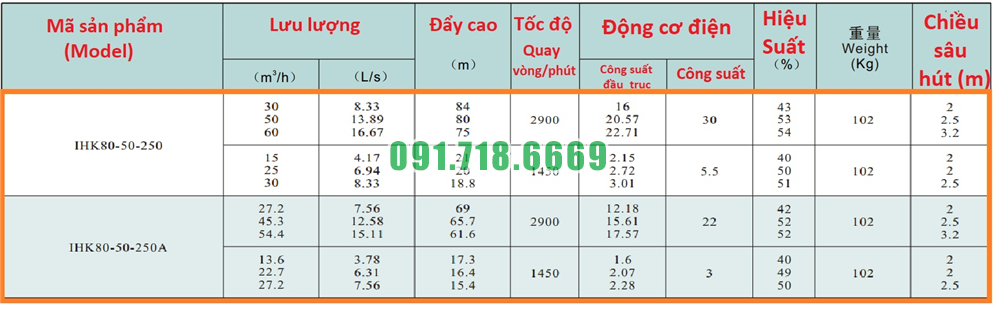 Bảng lưu lượng của máy bơm nước li tâm cánh hở IHK80-50-250 làm bằng inox