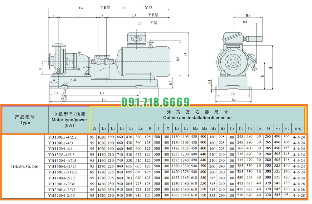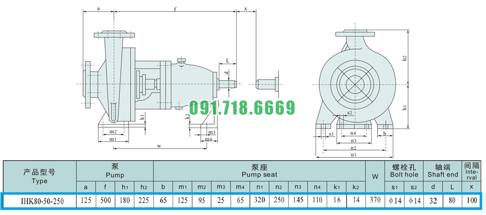 Kích thước lắp đặt của máy bơm nước li tâm cánh hở IHK80-50-250 làm bằng inox