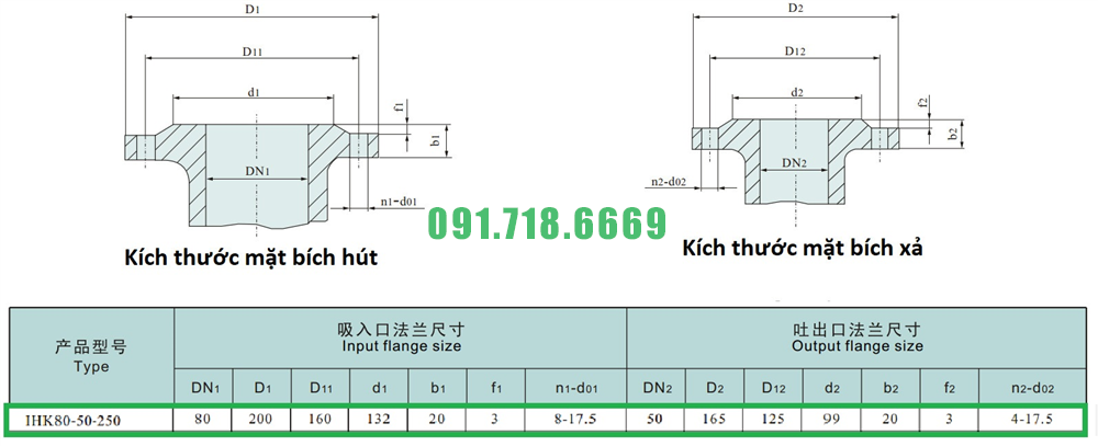 Kích thước mặt bích của máy bơm nước li tâm cánh hở IHK80-50-250 làm bằng inox