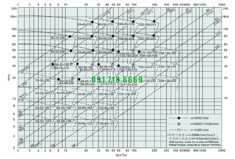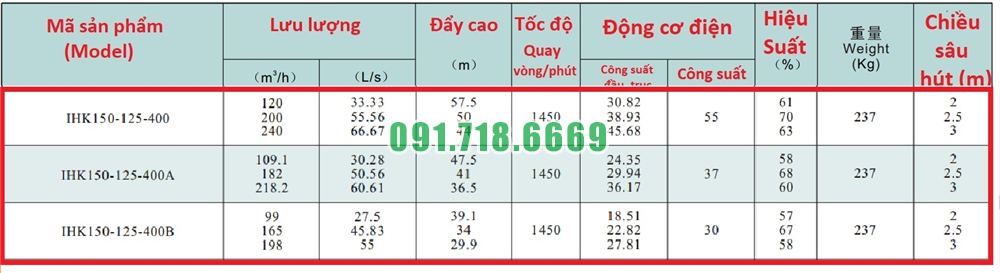 Bảng lưu lượng của bơm li tâm cánh hở công suất 55 kw model IHK150-125-400