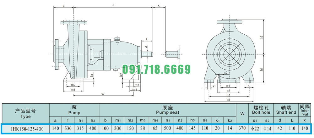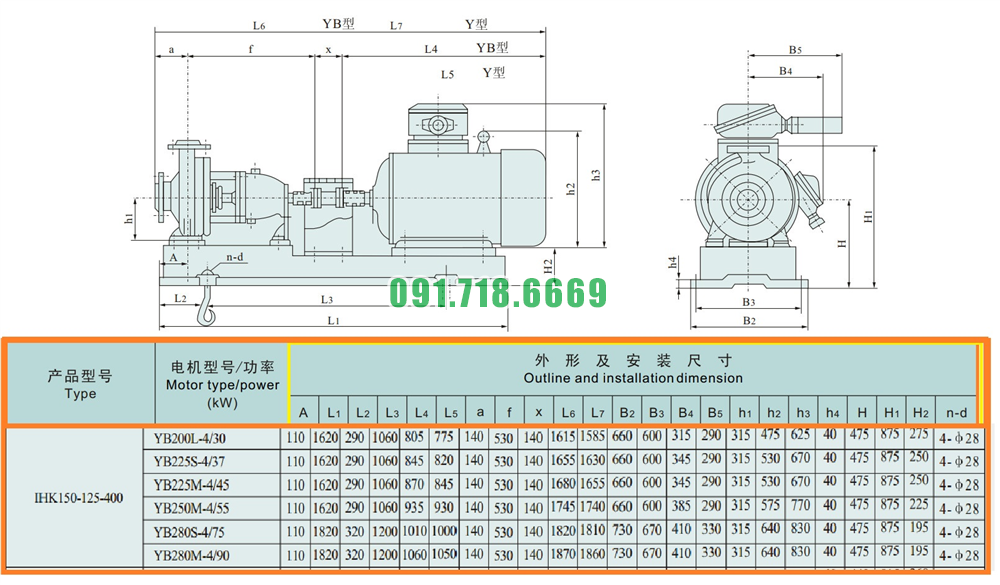 Kích thước của đầu bơm li tâm cánh hở công suất 55 kw model IHK150-125-400