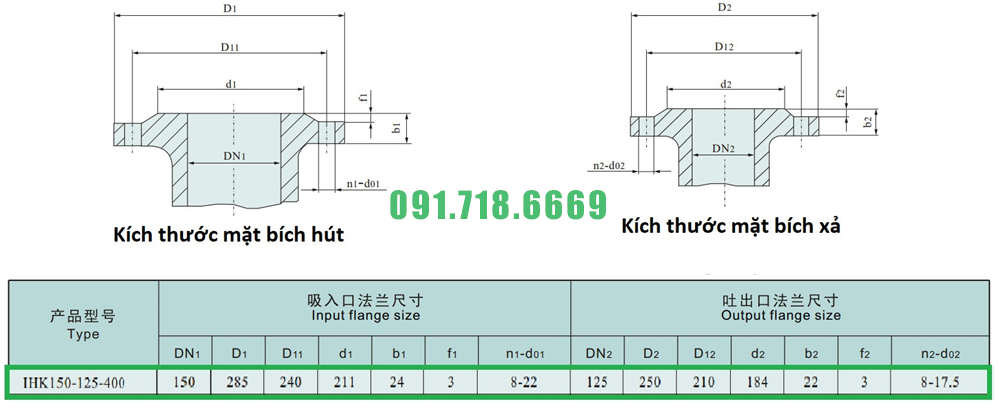 Kích thước mặt bích của bơm li tâm cánh hở công suất 55 kw model IHK150-125-400