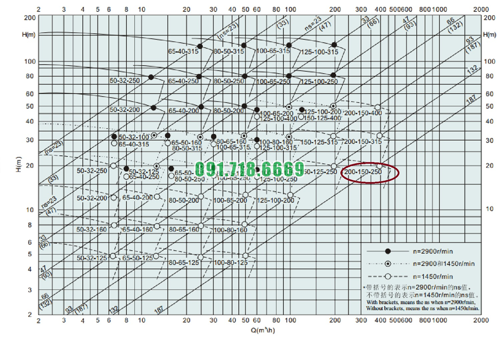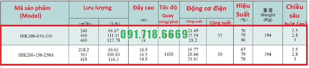 Bảng lưu lượng của bơm li tâm cánh hở đường thoát 150mm model IHK200-150-250