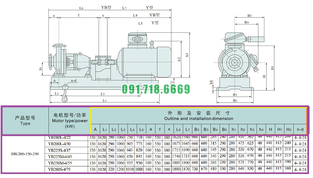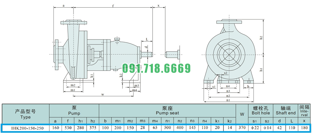 Kích thước lắp đặt của bơm li tâm cánh hở đường thoát 150mm model IHK200-150-250