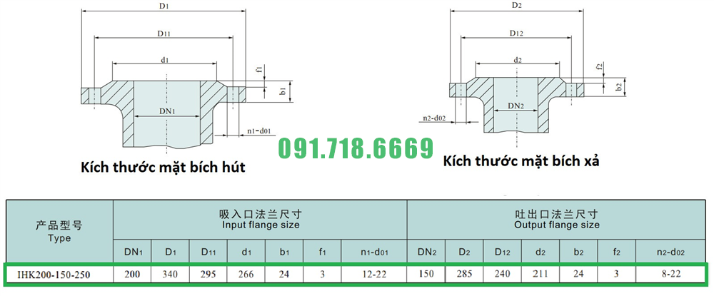 Kích thước mặt bích của bơm li tâm cánh hở đường thoát 150mm model IHK200-150-250